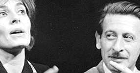 Image: George Tabori with his wife, Viveca Lindfors, talk during the rehearsals for "Brecht on Brecht" in 1961 in New York City. (Credit: Henry Grossman)