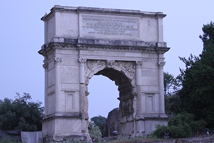 Image: author photo of the Arch of Titus, erected by Domitian in c. 81 CE at the foot of the Palatine hill on the Via Sacra in the Forum Romanum, Rome