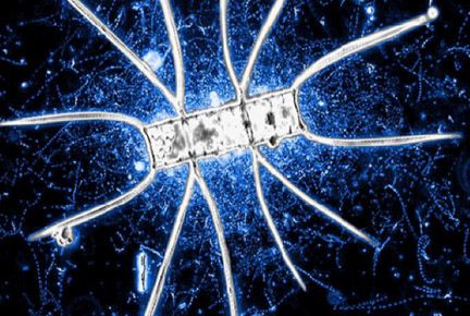 Teaser image: A microecosystem of bacteria (their tracks in blue) feeds off organic matter leaking from a much larger spiny white marine diatom (center). Credit: ETH Zurich / Vicente Fernandez, Steven Smriga and Roman Stocker