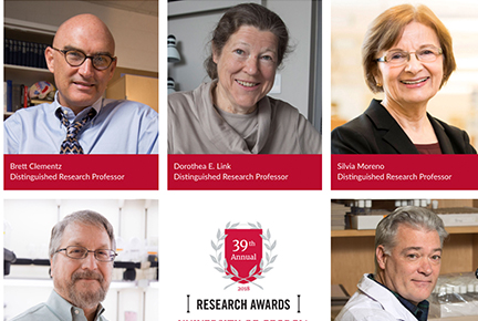 Brett Clementz, a professor in the psychology department; Dorothea E. Link, a professor in the Hugh Hodgson School of Music; Silvia J. Moreno, a professor in the cellular biology department and director for the NIH Training Grant in Tropical and Emerging Global Diseases; and Michael Tiemeyer, professor in the department of biochemistry & molecular biology and associate director of the Complex Carbohydrate Research Center, were named 2018 Distinguished Research Professors, awarded to faculty who are internationally recognized for their original contributions to knowledge and whose work promises to foster continued creativity in their discipline
