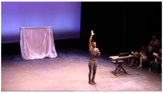 They have been developing it here in the department of theatre & film studies over the past few months, utilizing a bare bones approach with both shadow puppetry and ventriloquism. Both Marlon Burnley and Charlie Cromer began developing with John Terry while they were in the midst of rehearsing and performing in our final show of last season, Othello (in which they played Othello and Iago, respectively). Professor T. Anthony Marotta (whose puppetry work informs most of his directorial efforts) helped the students develop the puppetry-centric elements of the show and Professor George Contini (Head of Acting Program) provided some guidance for the production as well.