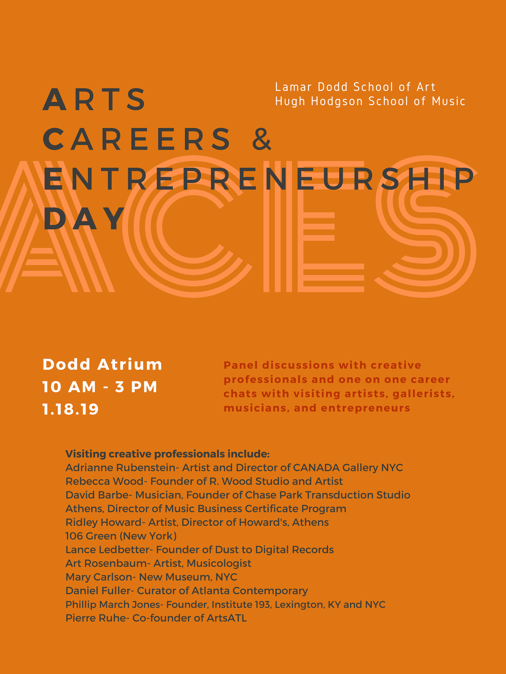 Supporting our students as they establish career goals and move toward the next steps in their professional lives working in the arts, the Hugh Hodgson School of of Music and the Lamar Dodd School of Art present Arts Career Entrepreneurship Day on Friday, January 18 from 10 a.m. to 3 p.m. in the atrium of the School of Art.