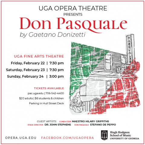The University of Georgia Opera Theatre, along with esteemed guest artists, take on the beloved opera Don Pasquale by Gaetano Donizetti at the Fine Arts Theatre. The opera is set to run February 22 and 23 at 7:30 p.m. and Sunday, February 24 at 3 p.m.