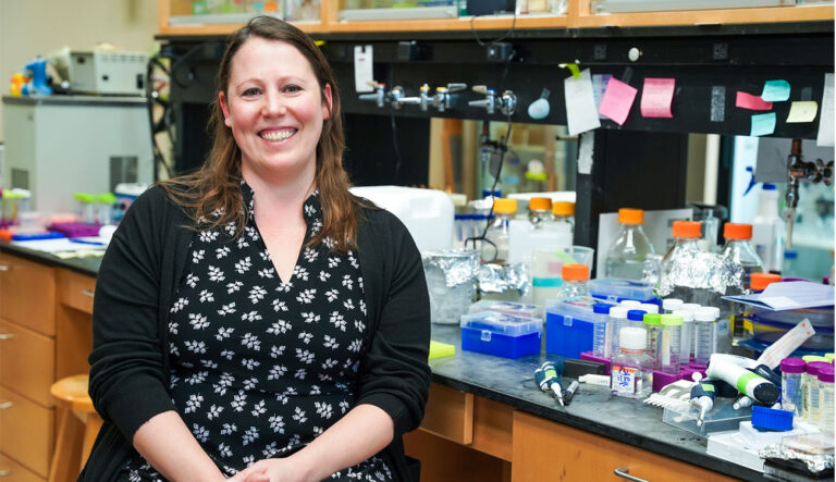 Image: Researcher Breeanna Urbanowicz develops better methods to alter cell wall structure to facilitate use in biofuels and other bioproducts. (Photo by Lauren Corcino)