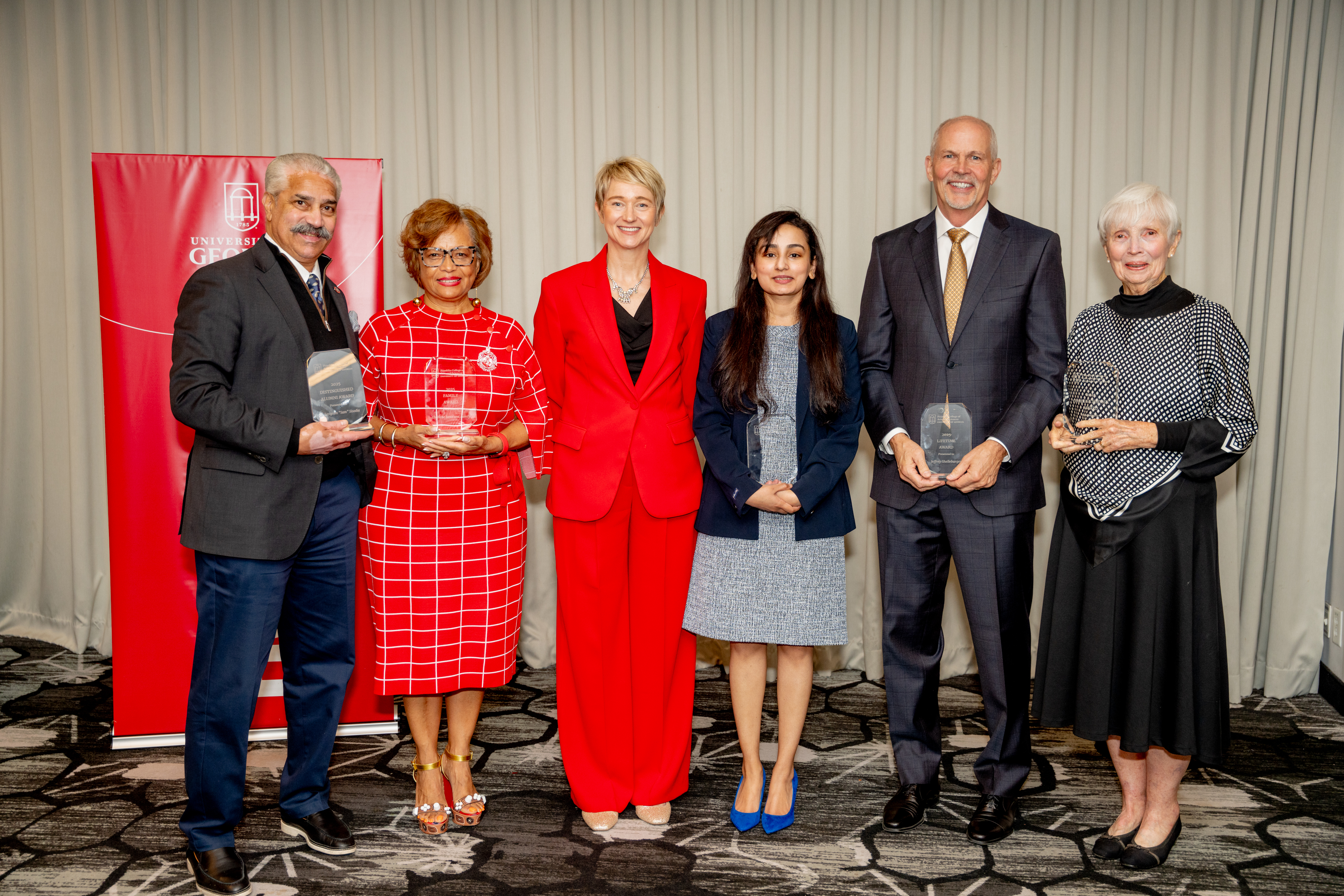 Image: From left: Dr. Sangram “Sam” Sidodia, Charlene Benn, Dean Anna Stenport, Sharmin Pathan, Jeff Shellebarger, and Peggy Galis. All photos by Jason Thrasher.